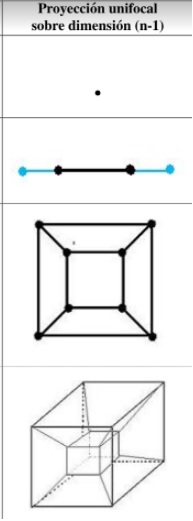 Asma dezagun nola izango zen n-kubo baten aurreko (n-1)-dimentsioan proyekzioa. Adibidez, lauki baten alde baten erdibitzailean dagoen foku batetik alde hori dagoen zuzenean proyektatuz gero, zuzenki bat beste zuzenki barruan ikusi egingo dugu.